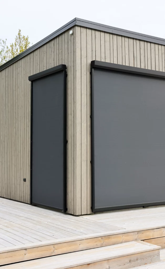 Hestra Otto är en vertikalmarkis med zip-funktion som håller väven stabil även i vindutsatta lägen. Den filtrerar solljuset, minskar värmeinstrålning och bevarar utsikten – perfekt för stora glaspartier och moderna fasader.